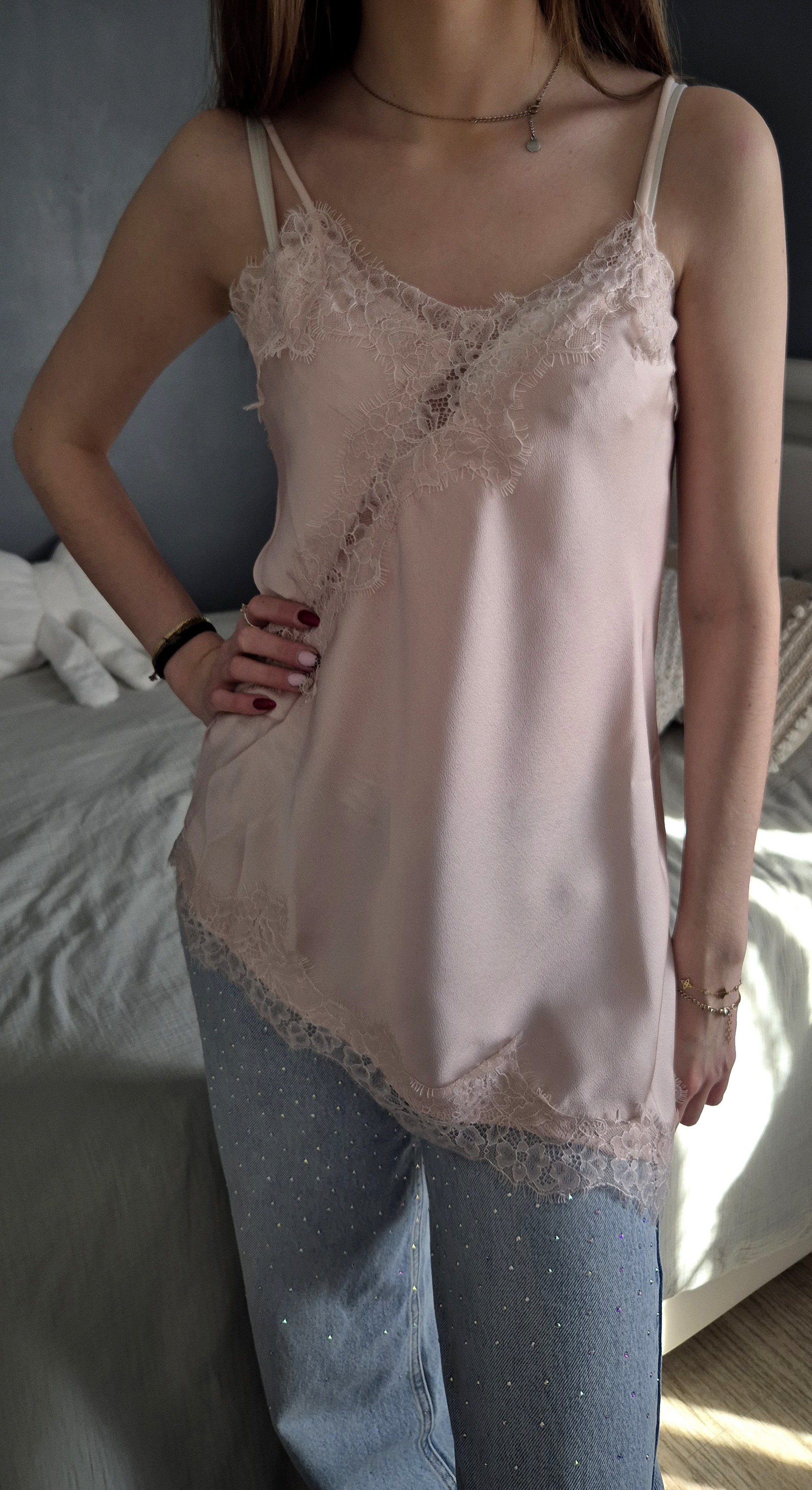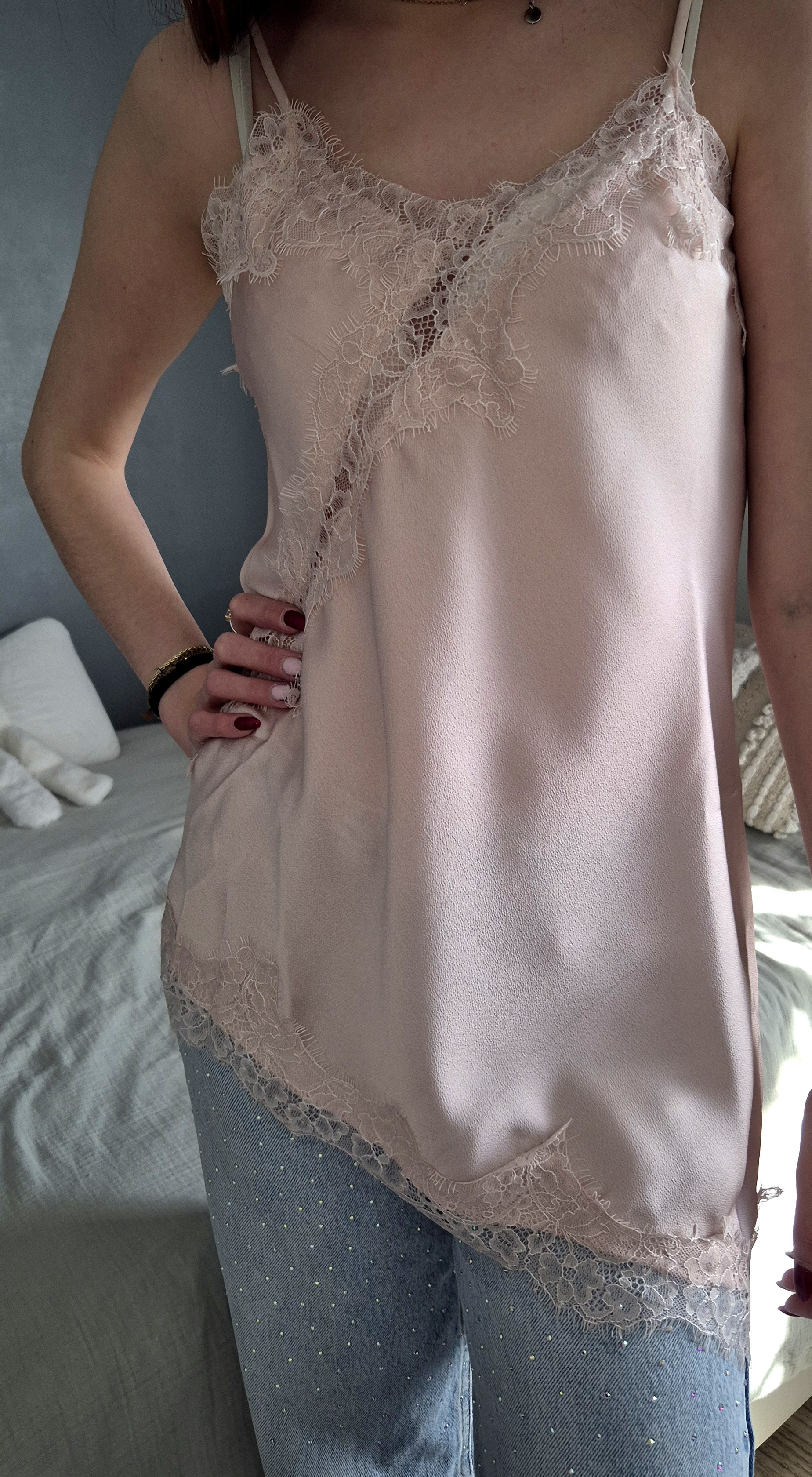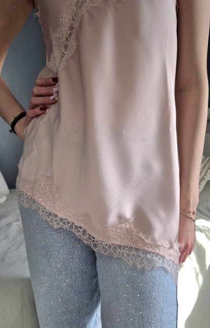 Top asymétrique dentelle coloris rose poudré